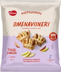 Vaasan Kotiuunin Omenaviineri on todellinen viinereiden klassikko. Näiden kanelintuoksuisten viinereiden täytteeseen olemme laittaneet omppuja niin että tuntuu. Kannattaisi ehkä paistaa saman tien kaksi pussillista: tuppaavat katoamaan nopeasti pelliltä.